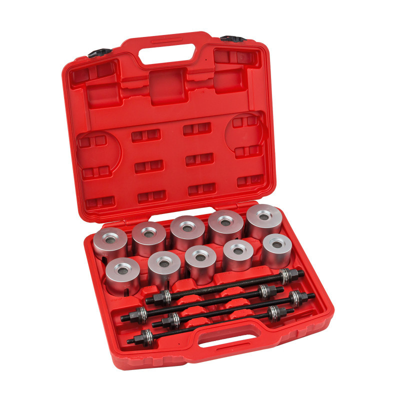 Sada na sťahovanie silentblokov alebo ložísk kolies. Sada pozostáva z 20 puzdier s kontrolným výrezom, 4 vretien s guľovými ložiskami a maticami. Uložené v kufríku.