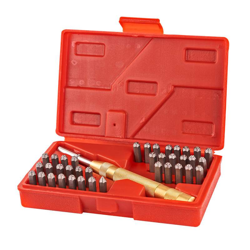 Kompletná sada razníc s číslicami a abecedou v praktickom PVC kufríku. Razenie bez použitia ďalších nástrojov vďaka dvojitému pružinovému mechanizmu v raziacej tyči.